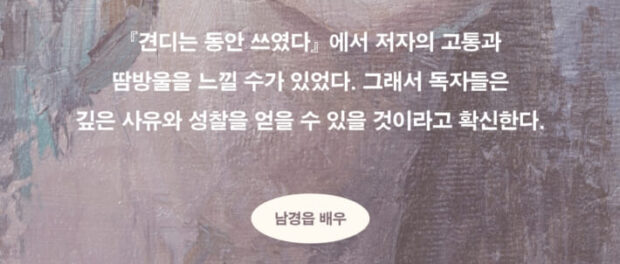 『견디는 동안 쓰였다』는 잘 사는 법을 설명하지 않는다. 대신 어떻게 덜 무너지며 여기까지 와 있는지를 보여준다. 하루를 버티는 일이 버거운 순간, 이 책은 말없이 곁에 앉아 “아직 남아 있다면, 그것으로 충분하다”고 말한다.