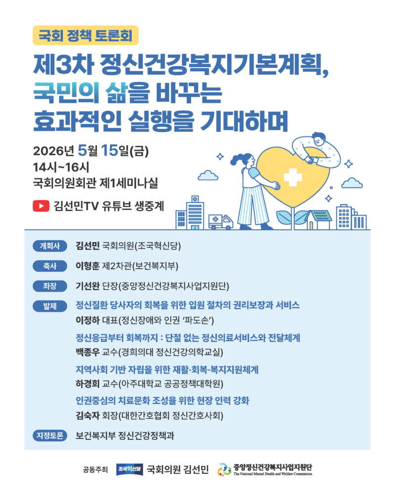 이번 행사는 제3차 정신건강복지기본계획(2026~2030) 실행력을 높이기 위한 논의의 장으로 마련됐다. 토론회는 ‘제3차 정신건강복지기본계획, 국민의 삶을 바꾸는 효과적인 실행을 기대하며’를 주제로 열린다.
